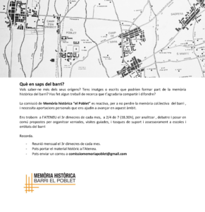 - Vols formar part de la Comissió de Memòria Històrica del Poblet?Què en saps del barri? Vols saber-ne més dels seus orígens? Tens imatges o escrits que podrien formar part de la memòria històrica del barri? Has fet algun treball de recerca que t’agradaria compartir i difondre? La comissió de Memòria històricaView More